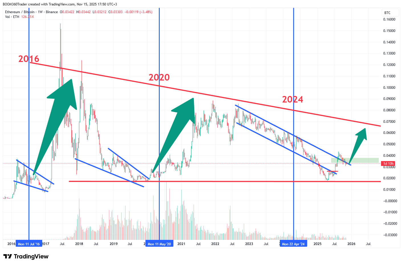 Bizakodásra egyedül az a historikus minta adhat okot, amit az ETH/BTC kereskedési pár jelez. A piaci ciklusok 2016-ban, 2020-ban és 2024-ben is rendre éles mozgásokat váltottak ki az év ezen időszakában, a csatolt grafikonon pedig jól látható, hogy kulcsfontosságú trendvonal alakult ki a jelenleg is látható tartományban.
