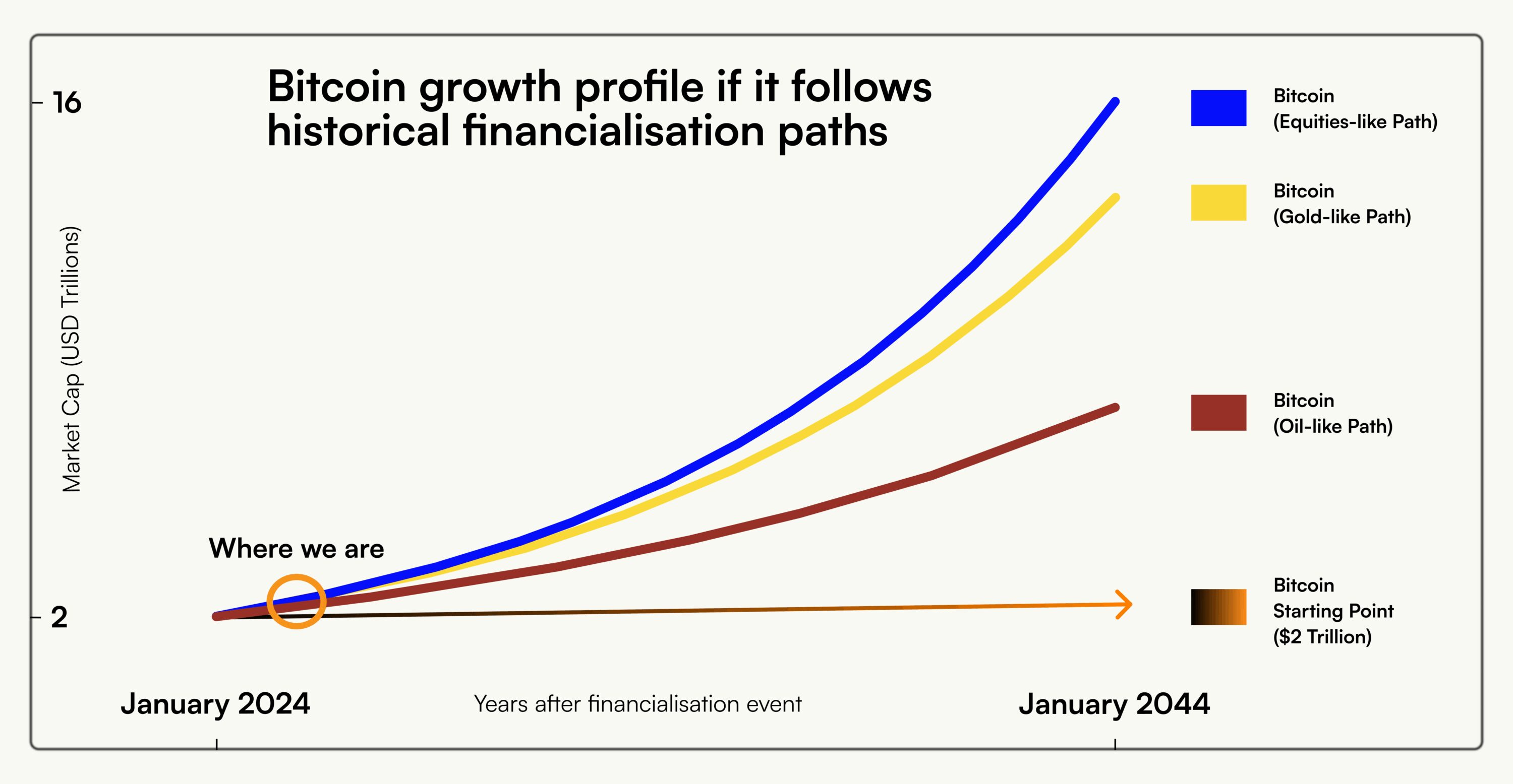A Bitcoin már most is úgy viselkedik, mint minden eszközosztály, amely átesett ezen az átmeneten. Az aranyhoz hasonlóan széles körben elismert értéktároló. Az olajhoz hasonlóan volatilitása lehetőségeket teremt a derivatív ügyletek és a strukturált stratégiák számára. A részvényekhez hasonlóan kezdi támogatni a hitelezést és a másodlagos hozampiacokat.