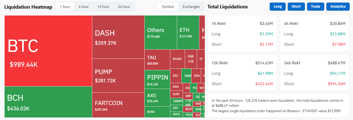 A CoinGlass adatai szerint a tőkeáttételes pozíciók felszámolása szintén az emelkedést segítette: az elmúlt 24 órában 126 ezer kereskedőt likvidáltak 688 millió dollár értékben, ennek a megoszlása pedig 595 millió dollár az eladási (short) oldalól és 93 millió dollár a vételi (long) oldalról. Ennek köszönhetően az elmúlt hónapok egyik legnagyobb felszámolását láthattuk a short-oldalról.