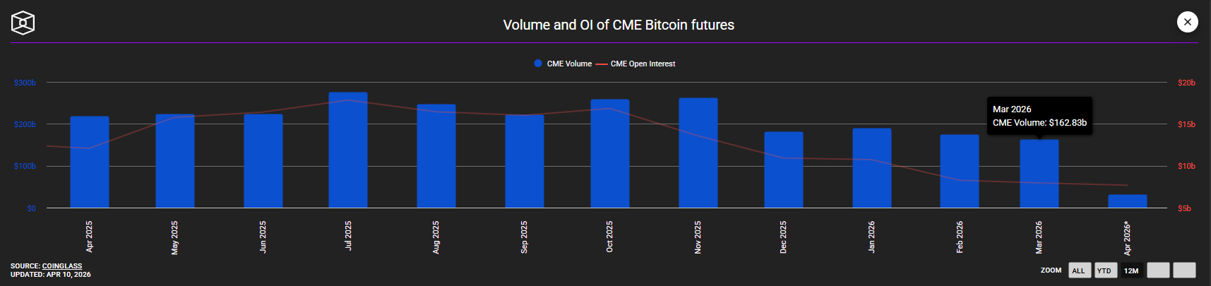 A CME Bitcoin futures volumen és a nyitott pozíciók alakulása 2025 és 2026 áprilisa között. Forrás: TheBlock