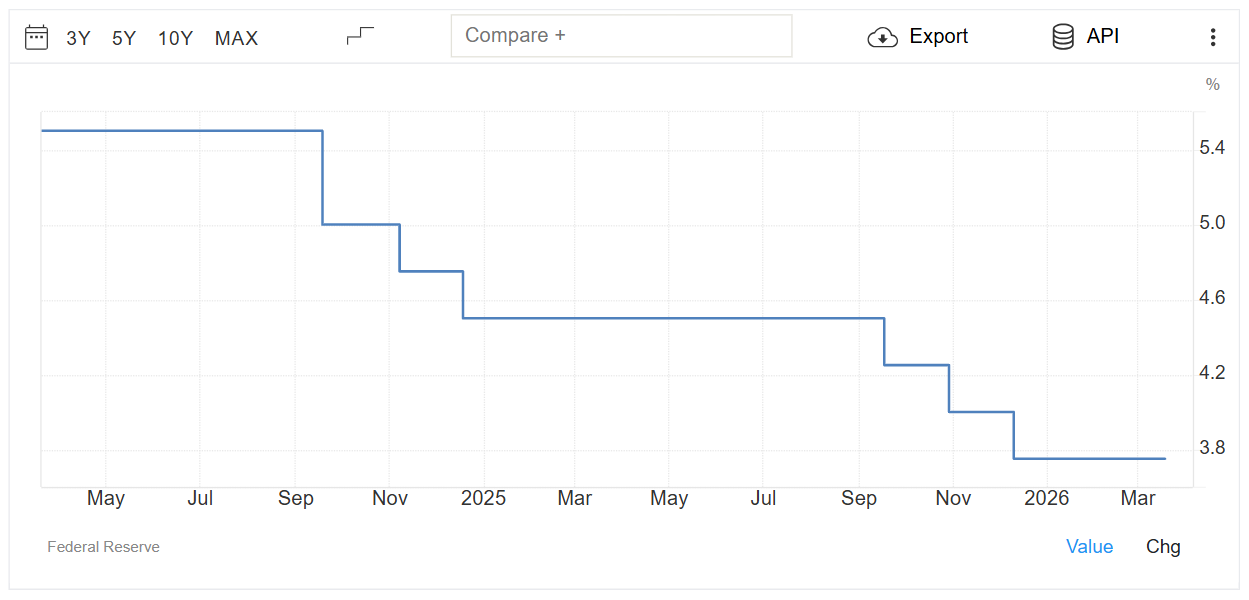 A jelenleg érvényben lévő amerikai alapkamat 3,50-3,75%-on áll, 2025 novembere óta változatlanul. Bár 2024 decembere és 2025 szeptembere között ugyanúgy láthattunk egy hosszabb periódust, amikor Jerome Powell jegybankelnök nem nyúlt az alapkamatokhoz, most más irányból kell szemlélni a dolgokat. Az olajárak masszív emelkedése ugyanis beépül a gazdaság minden szegmenségbe, vagyis az inflációt sokkal nehezebb féken tartani.