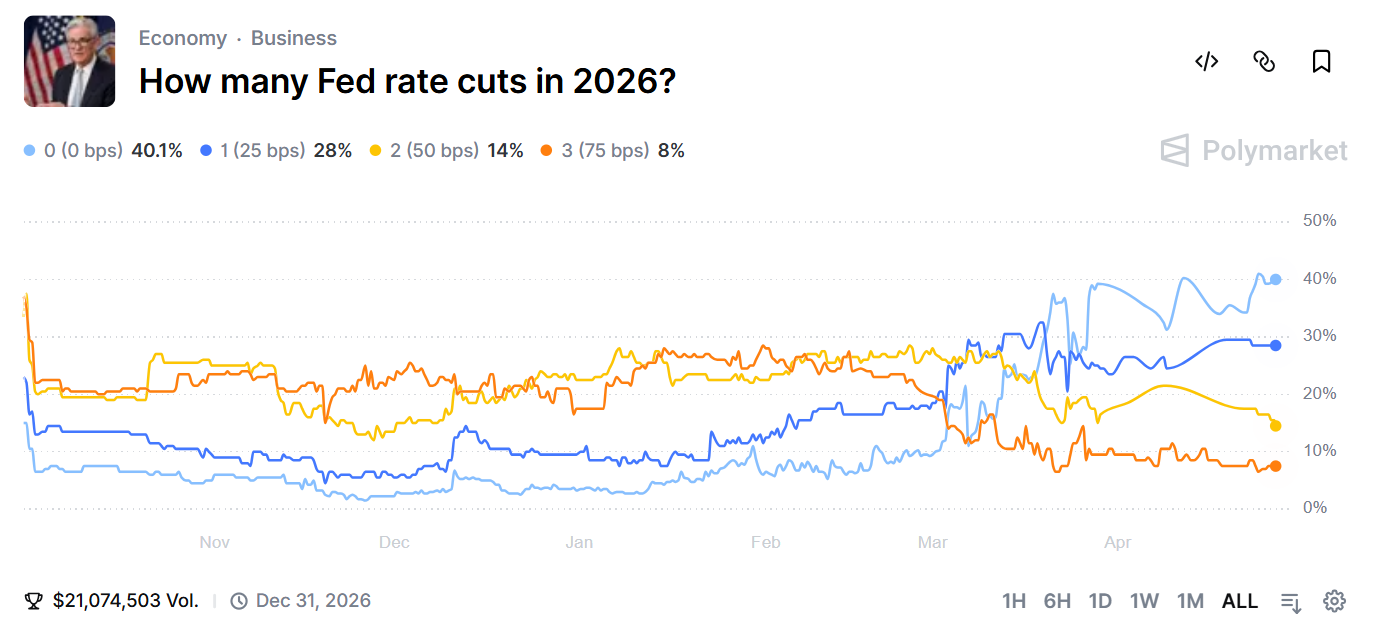 A hazánkban betiltott Polymarket és Kalshi fogadói szerint az április 29-i FOMC ülésen sem fog kamatot vágni az amerikai jegybank, és egyre kisebb esélyt lát az internet bölcs közössége arra, hogy idén akár egy 25 bázispontos kamatvágást is láthassunk. Marad az alapkamat 3,50-3,75%-on az év második felében is?