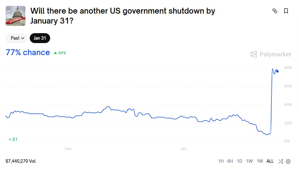 A V-alakú felpattanás első sorban a jen miatti aggodalmak, valamint az amerikai spending bill körüli feszültség miatt alakult ki: a demokraták ismét kormányzati leállással fenyegetik a kormányzatot, erre pedig a méltán hírhedt, hazánkban múlthéten betiltott Polymarket jelenleg 77%-os esélyt ad – egy több mint hétmillió dolláros piacon.