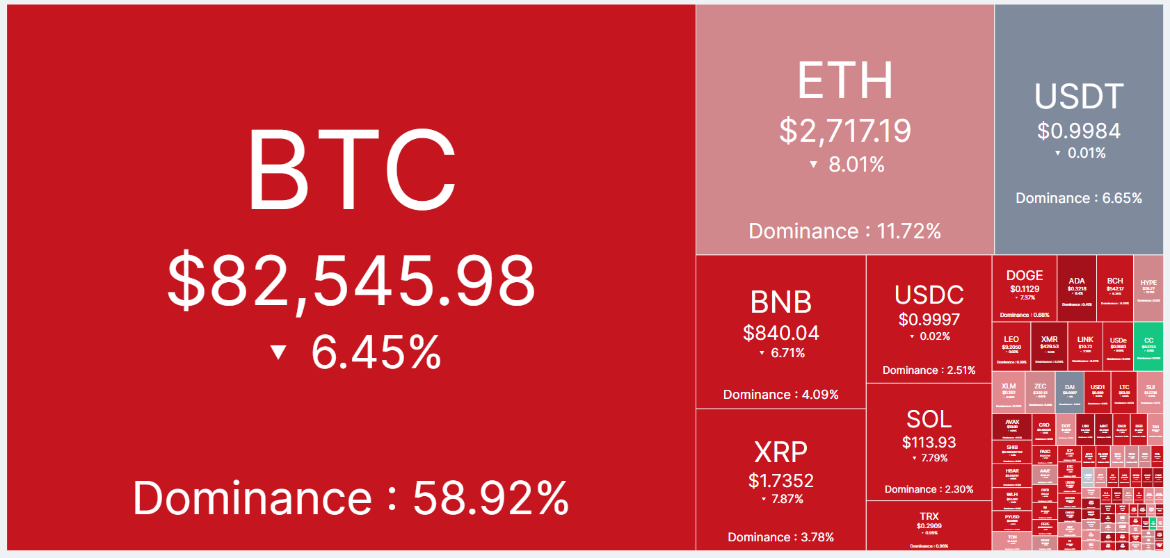 (BTC) folytatja visszakapaszkodását, miután az éjszaka folyamán egészen 81 000 dollárig esett vissza, jelenleg pedig a 82 800 dolláros szint megtartásával küzd. Az elmúlt 24 órában 7,5%-kal csökkent a kriptovaluta-piac teljes értéke, ami összefügg a BTC 6%-os esésével. A nagyobb altcoinok közül az ether