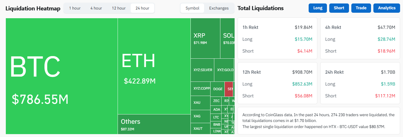 A mozgás hátterében egyértelmű katalizátorként vállalt szerepet a tőkeáttételes pozíciók likvidálása: a CoinGlass adatai szerint az elmúlt 24 órában mintegy 1,7 milliárd dollárnyi pozíció záródott be, ezek több mint 90%-a pedig long (vételi) pozíció volt. Összesen 274 ezer kereskedő érintett az év eddigi legnagyobb vérfürdőjében.