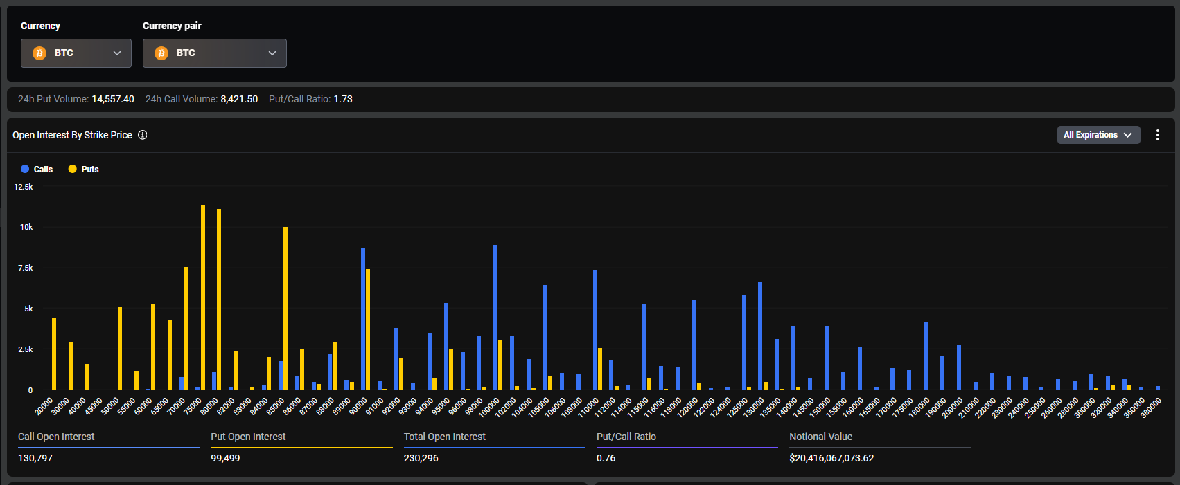 A Deribit adatai szerint körülbelül 23,6 milliárd dollárnyi BTC‑, és 3,8 milliárd dollárnyi ETH‑opció fut ki a december 26‑i, negyedéves és egyben éves lejáraton. Ez messze meghaladja az eddigi negyedéves csúcsokat, amikor „csak” 10–15 milliárd dollárnyi kontraktus került elszámolásra. A put/call arány 0,4 körül mozog, vagyis nagyjából háromszor annyi vételi (call), mint eladási (put) opció van nyitva, ami egyértelműen bikás pozicionáltságot jelez.