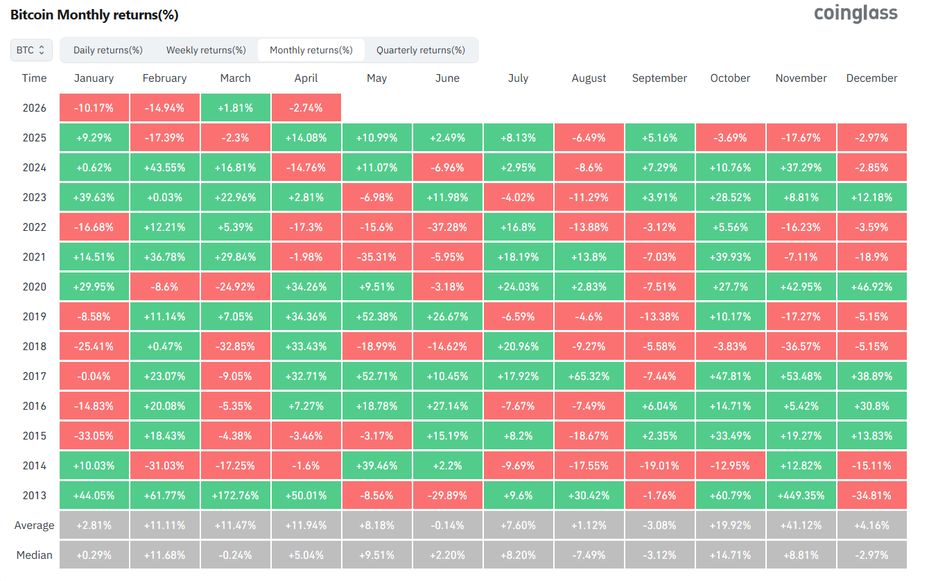 Az októberi történelmi csúcsot követően rekordmennyiségű likvidáció rázta meg a piacot, az utolsó negyedévben 23%-kal, idén első negyedévben pedig 22%-kal gyengült a vezető kriptovaluta. Ebben a periódusban láthattunk 10%-os, 14%-os, illetve 17%-os havi esést is, mindössze egyszer – 2026 márciusában – láthattunk havi növekedést, ami 1,81%-os volt.