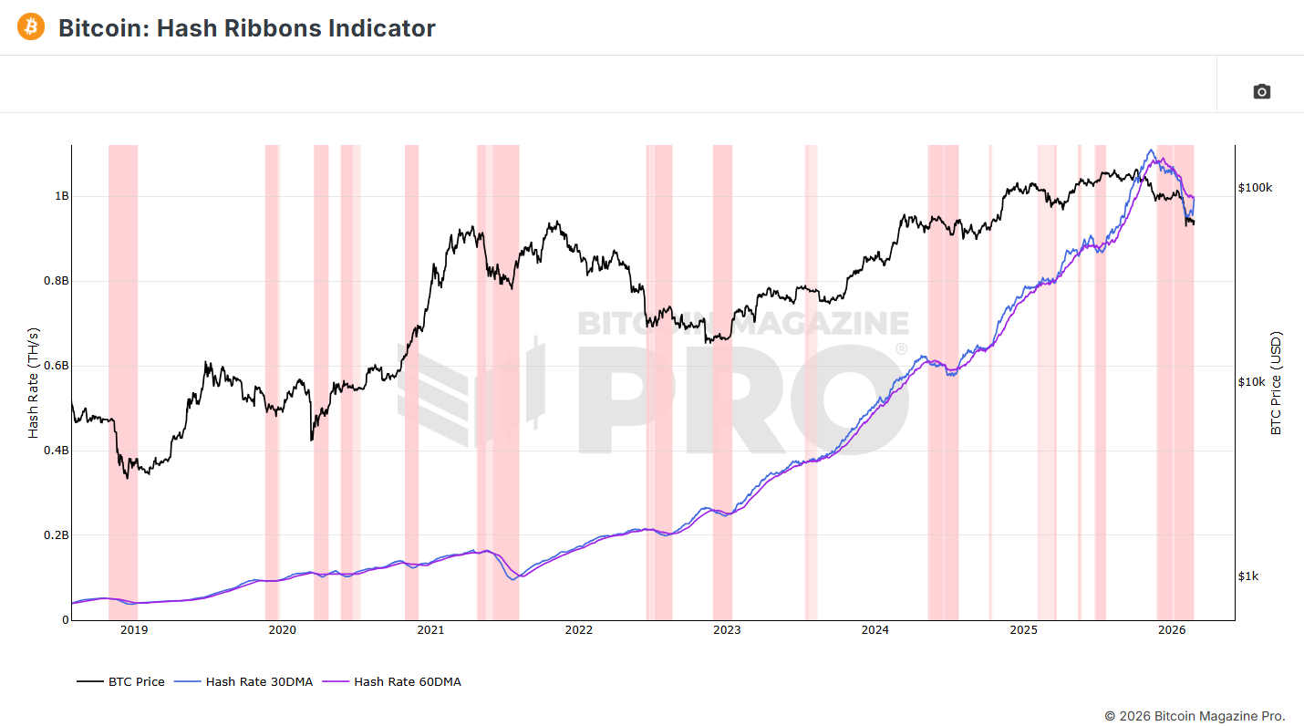 Technikai oldalról a lokális mélyponton található Hash Ribbon indikátor jelezheti a felpattanást, amely 2022 novembere óta nem volt ilyen alacsony. Az alacsony hashráta és a bányászkapituláció szintén az árfolyamok emelkedésének szólhat.