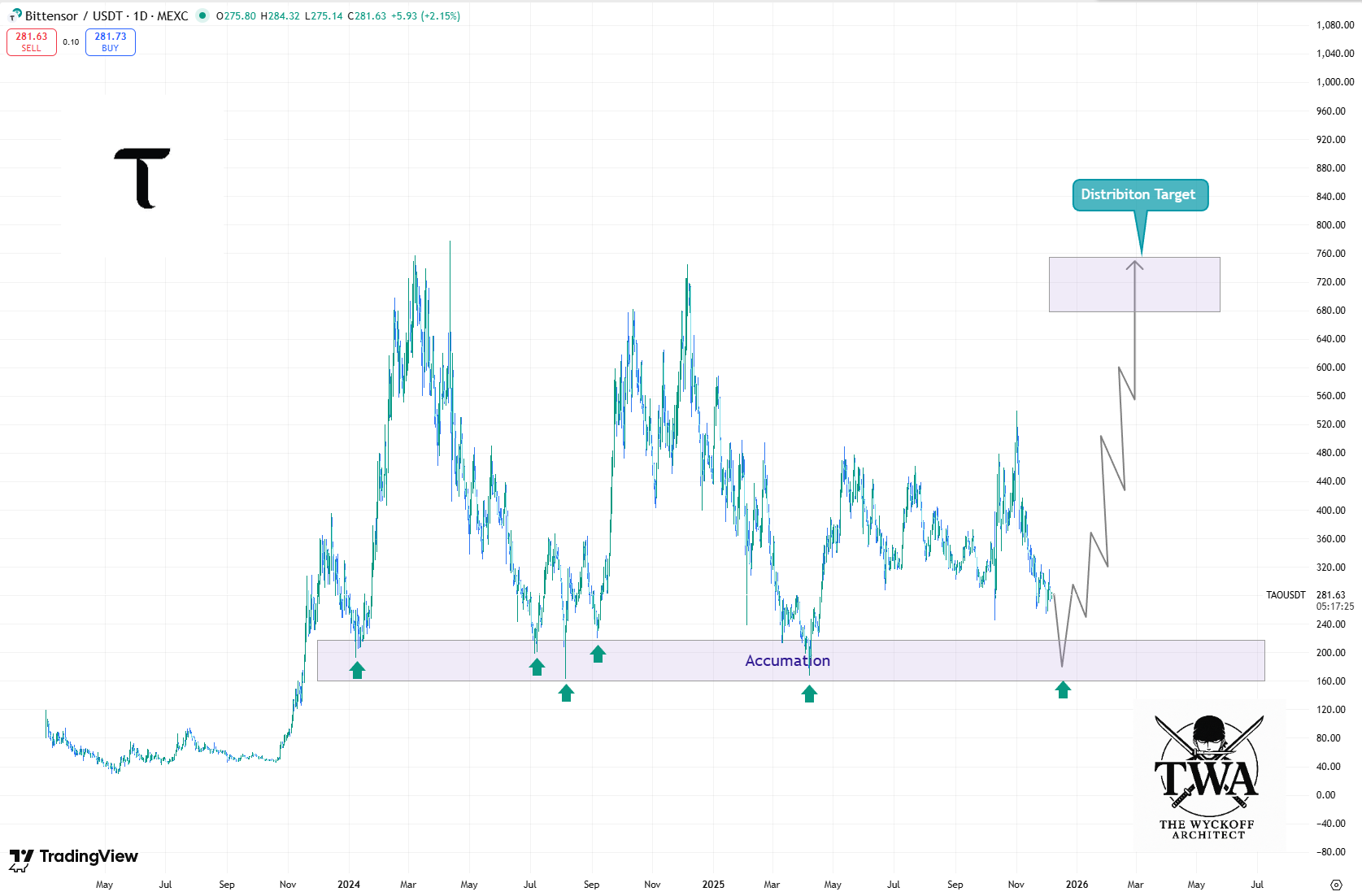 A Wyckoff‑logika szerinti forgatókönyv az, hogy egy esetleges „sell the news” leszúrás akár ismét a 150-200 dollár környéki akkumulációs sávba nyomhatja vissza a TAO‑t, ahonnan csak fokozatosan, lépcsőzetes emelkedéssel nyílhat tér a grafikonon jelzett 700–800 dolláros disztribúciós zóna felé, ha a fundamentális sztori és a hálózati növekedés igazolja a bikák elképzeléseit.