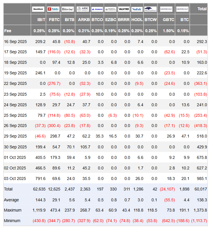 (BTC) új történelmi csúcsot állított fel 125 800 dollár magasságában. Az amerikai vagyonkezelők indulásuk óta legnagyobb tőkebeáramlásukat tapasztaltak, miután szeptember 29 és október 3 között összesen 3,24 milliárd dollárnyi tőke áramlott a tőzsdén kereskedett eszközökbe.