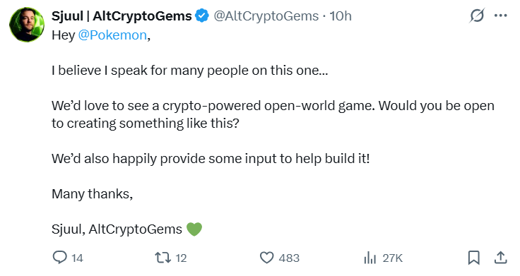 Az AltCryptoGames néven ismertté vált holland kriptovállalkozó és véleményvezér, Sjuul Follings, akinek 408 ezer követője van az X-en, február 14-én egy posztban kifejezte érdeklődését egy Pokémonnal közös együttműködés iránt. Ennek célja egy kriptoalapú, nyílt világú játék fejlesztése lenne.