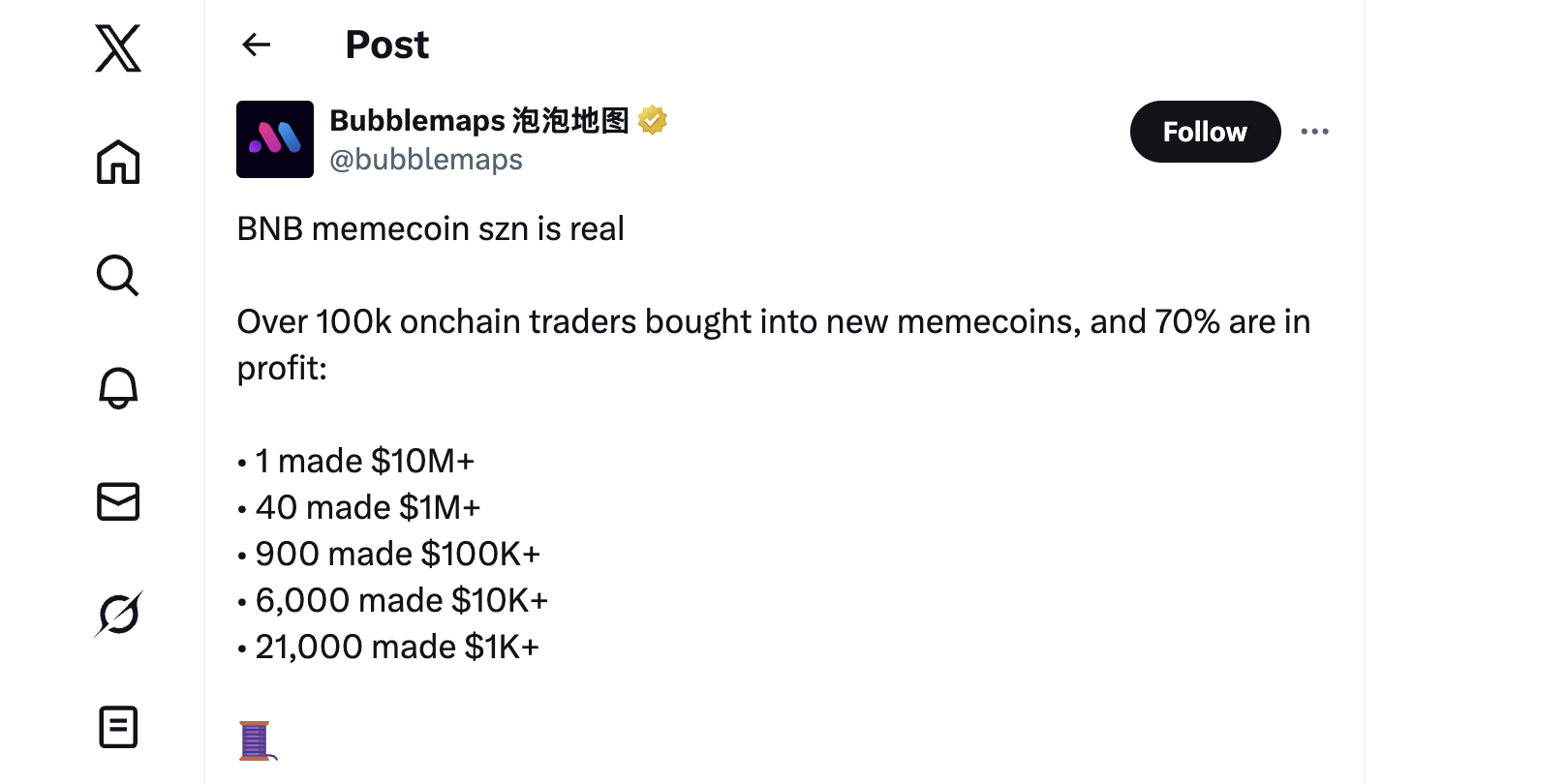 A Bubblemaps adatai szerint több mint százezer ember csatlakozott már a BNB-alapú mémcoin-őrülethez, melynek köszönhetően 93 ezer kereskedő együttesen 516 millió dolláros nyereséget ért el. A vesztes oldalon egyelőre 39 ezer kereskedő található, akiknek a kombinált vesztesége 114 millió dollárra tehető – ebből is látszik, hogy bár nem teljesen kockázatmentes, a Binance hálózatán kifejezetten nagy összegekre lehetett szert tenni.