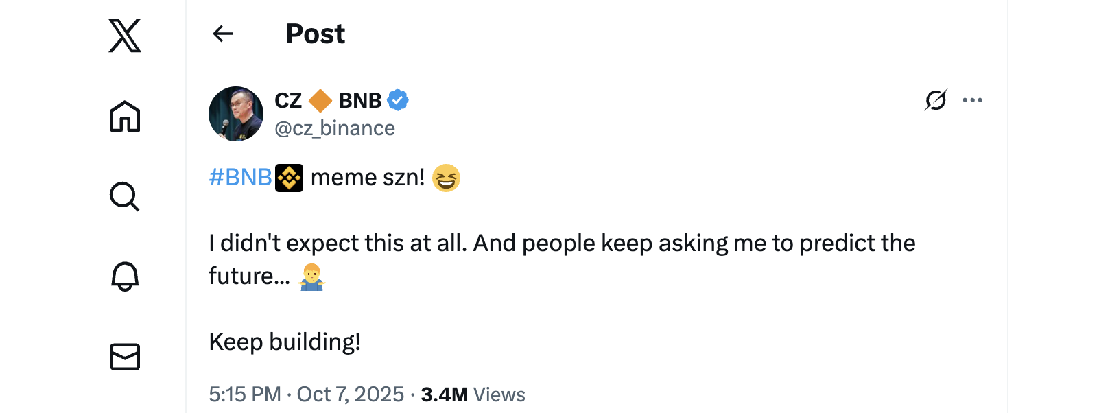 A felfutás egybeesett a BNB árfolyamának új csúcsra törésével, valamint a Binance-alapító Changpeng “CZ” Zhao nevéhez köthető mémtokenek hullámával. A hype akkora lett, hogy még maga CZ is reagált a közösségi médiában: