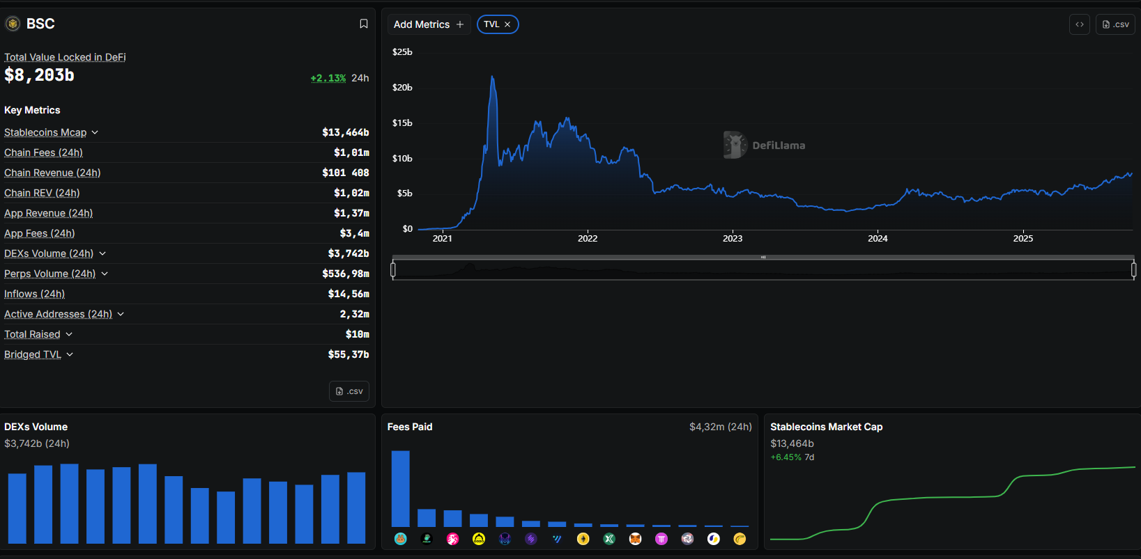 - Erős DeFi, DEX és stablecoin aktivitás a BNB Chain-en