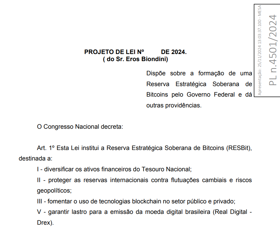 A PL4501/2024 számú törvényjavaslathoz benyújtott alternatív szöveg – amelyet a Ház Gazdaságfejlesztési Bizottsága terjesztett elő – egy Nemzeti Bitcoin Stratégiai Tartalék (RESBit) létrehozását javasolja. A javaslat szerint a brazil kormány öt éven alatt fokozatosan legalább 1 millió BTC felhalmozását célozza meg. A lépés célja az ország pénzügyi ellenálló képességének növelése, a tartalékok diverzifikálása és Brazília globális versenyképességének erősítése a digitális eszközök világában. A RESBit a tervek szerint stratégiai eszközként működne, amely alternatívát vagy kiegészítést jelentene a hagyományos deviza‑ és aranytartalékok mellett. Nem most merült fel ennek az ötlete, már tavaly nyáron is meghallgatást tartott róla a gazdaságfejlesztési bizottság.