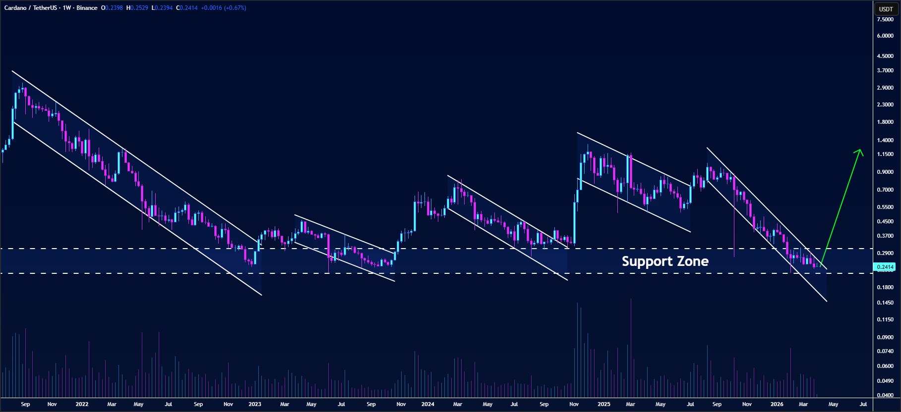 A csatolt grafikonon jól látszik, hogy az ADA a 2021-es bikapiac vége óta folyamatos lefelé tartó csatornákban mozog, amiket kisebb emelkedési hullámok tudtak csak megszakítani például 2023 és 2024 utolsó negyedévében.