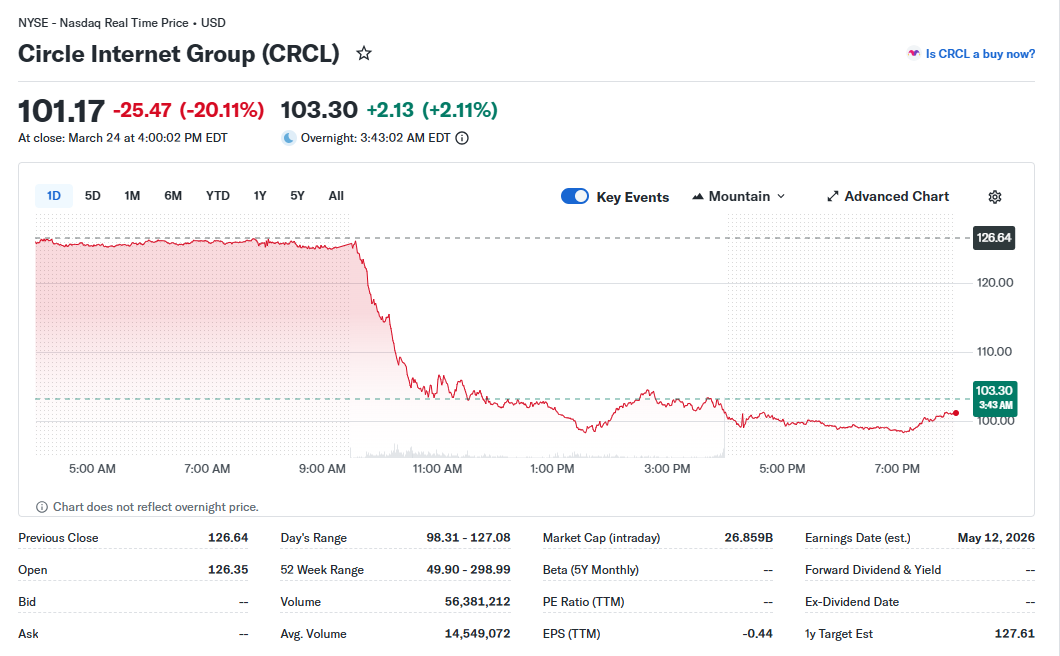 A keddi kereskedési napon a Circle NYSE-n jegyzett részvénye, a CRCL, több mint 20%-os zuhanást szenvedett el, amivel egy pillanat erejéig, de 100 dollár alá esett be. Ez az eddigi legrosszabb kereskedési napot eredményezte a vállalat rövid, de annál izgalmasabb történetében: a stabilcoin-kibocsátó 2025 júniusában lépett tőzsdére, részvényárfolyama pedig a 300 dollárt is megközelítette.