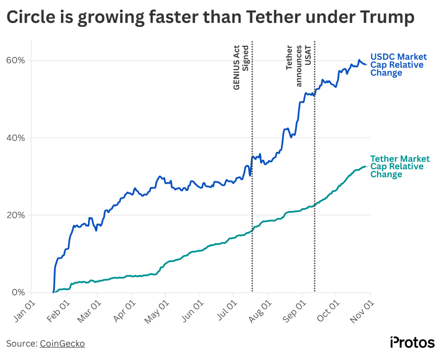 A piacra olyan szereplők is fokozatosan beléptek, mint a PayPal, azonban az elmúlt egy év legnagyobb növekedési ütemét a Circle diktálta, melynek mérete meghaladta a 75 milliárd dollárt is. Az USDC mögött álló kibocsátó hamar a szabályozók kedvencévé vált, és 2025 nyarán a tőzsdén is debütált.