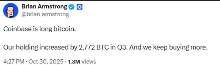 Az intézményi meggyőződés és elköteleződés a bitcoin iránt tovább mélyül, miután a nagyobb kriptovállalatok tovább erősítik tartalékaikat. A Coinbase, a legnagyobb amerikai kriptotőzsde október 30-án bejelentette, hogy 2772 BTC-vel növelte bitcoin pozícióját a harmadik negyedévben. Ez a lépés újra kiemeli a vállalat stratégiai döntését, hogy mérlegét a bitcoin hosszú távú értékajánlatához igazítsa.