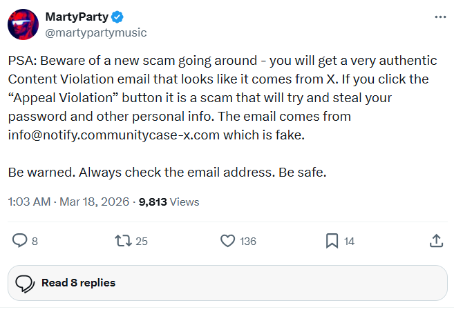Marty Party, egy makroelemző egy új scam kampányt jelölt meg, amely hamis „Tartalomsértés – Content violation” értesítésekre épül, amelyek leutánozzák a hivatalos X kommunikációt. Az e-mailek arra kérik a felhasználókat, hogy kattintsanak a „Szabálysértés elleni fellebbezés (Appeal Violation)” gombra, amelynek célja jelszavak és személyes adatok begyűjtése.