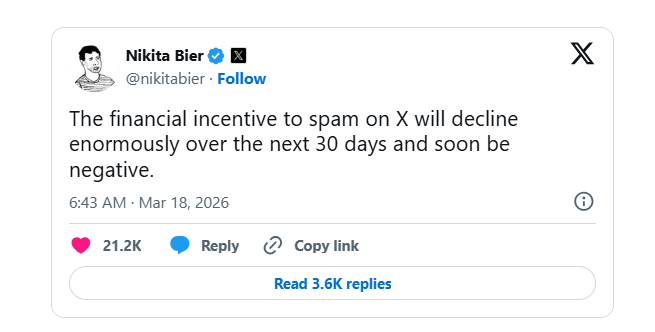 Eközben az X termékfejlesztési vezetője, Nikita Bier jelezte, hogy a platformon a spamelés pénzügyi ösztönzői 30 napon belül jelentősen csökkenni fognak, és végül negatívvá válhatnak.