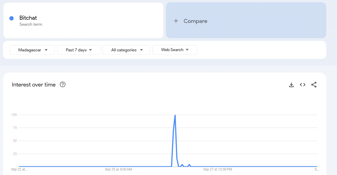 A Bitchat hatalmas letöltési hullámot tapasztalt Madagaszkáron a víz- és áramhiány miatti erőszakos tüntetések idején, amelyek arra kényszerítették a hatóságokat, hogy alkonyattól hajnalig tartó kijárási tilalmat vezessenek be a fővárosban. A Google Trends adatai szerint a Bitchatre történő keresések száma Antananarivóban nulláról 100-ra emelkedett, ahogy a tüntetők állami kontrollnak ellenálló kommunikációs alternatívákat kerestek.