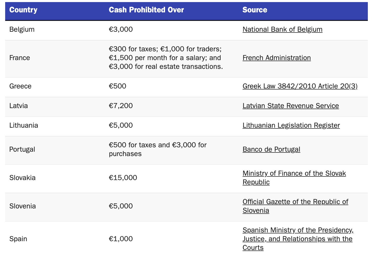 Készpénzes fizetési korlátozások az euróövezetben. Forrás: cato.org