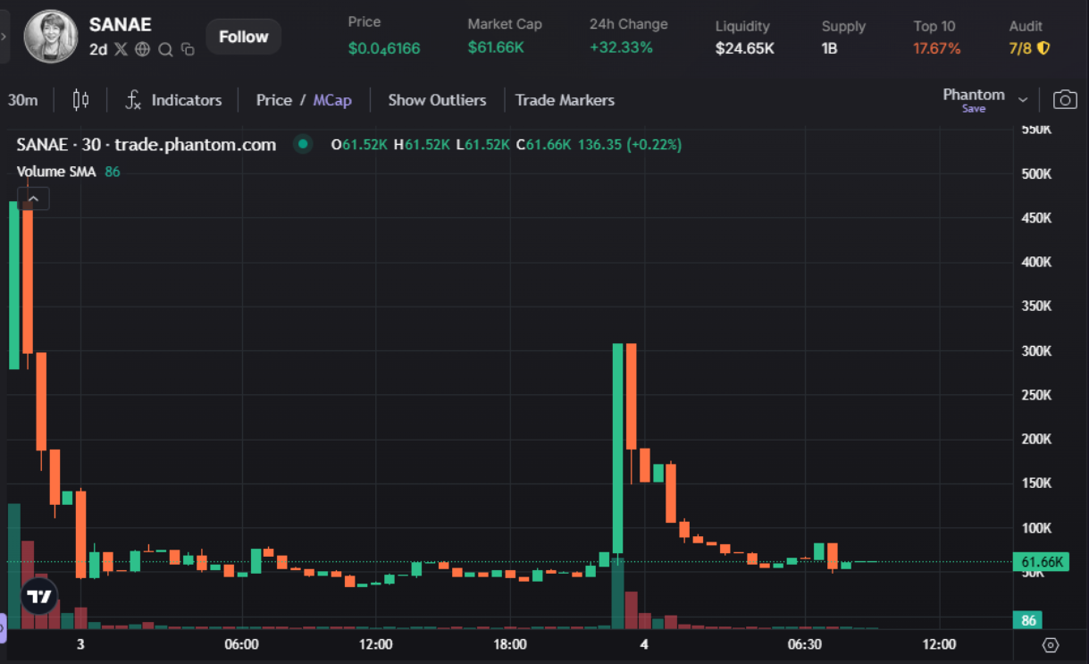 Takaichi miniszterelnök március 2-án közzétett X-bejegyzésében tagadta a kapcsolatot a token mögött álló csapattal, posztja pedig 66 milliónál is több megtekintést ért el. A token árfolyama ezt követően 58%-ot esett, piaci kapitalizációja pedig szinte teljesen elfogyott – ahogyan a likviditás is.
