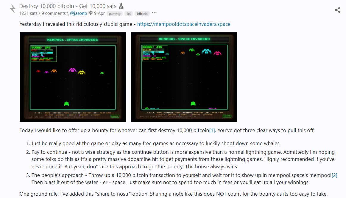 Aki elsőként semmisít meg 10 000 BTC‑t – ami nagyjából 730 millió dollárnyi valós Bitcoin‑tranzakciót jelent – 10 000 sat jutalmat (kb. 2200 forintot) kap a játék fejlesztőjétől, a Jasonb néven ismert alkotótól.