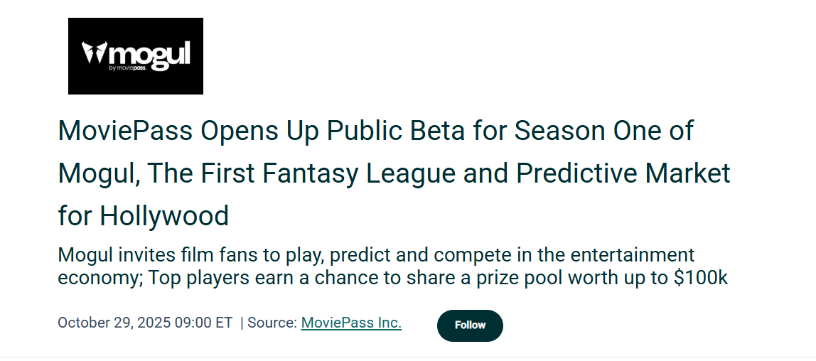 A MoviePass egy előfizetéses mozijegy-értékesítő szolgáltatás, amely lehetővé teszi a felhasználók számára, hogy mobilalkalmazásán keresztül az Egyesült Államok nagyjából bármely mozijában filmeket nézzenek. Egy közlemény szerint a cég október 29-én, szerdán tette elérhető azt a szolgáltatást, amivel a felhasználók fogadhatnak a mozipénztárak teljesítményére. A vállalat közölte, hogy Mogul névre keresztelt új szolgáltatása nyilvános bétatesztelési szakaszba lépett, lehetővé téve a fogadást Hollywood első fantázialigájában és prediktív piacán.