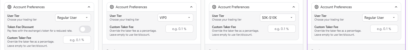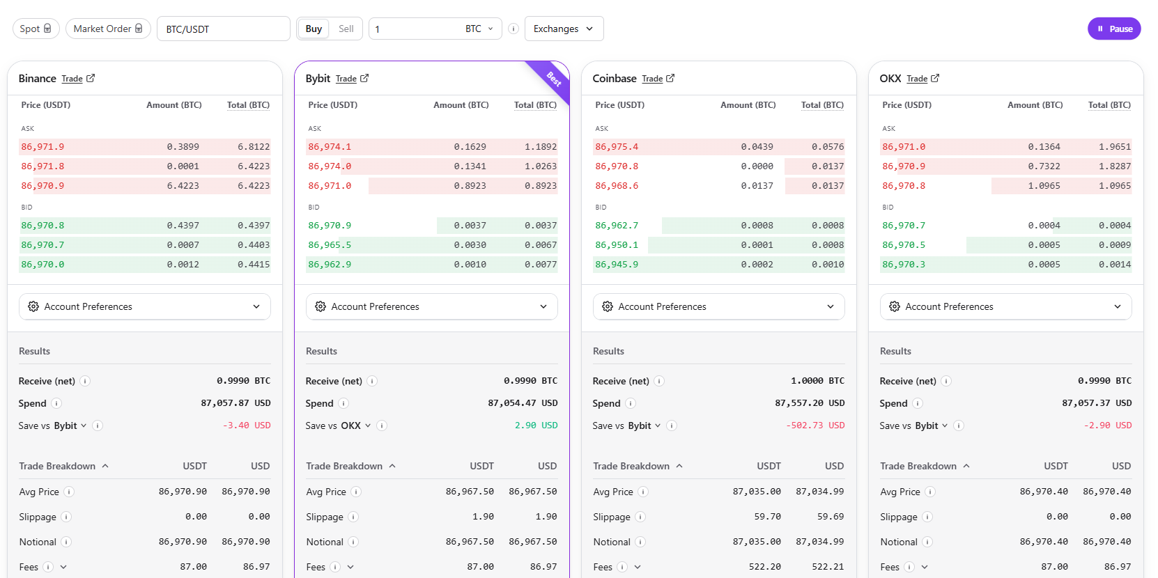 Megmutatja a rendelkezésre álló likviditás alapján az árfolyamcsúszást, a párosspecifikus díjkülönbségeket és esetleges kedvezményeket is. Az Exhanges menüpont segítségével hozzáadható és kiszűrhető egy specifikus tőzsde, ami arra utal, hogy az összehasonlító funkció majd más platformokra is ki fog terjedni. Az Account Preferences legördülő menüben beállítható, hogy milyen felhasználók legyen összehasonlítva a tőzsdéken, és az is bekapcsolható, hogy megmutassa az eszköz a kedvezményeket, ha az adott tőzsde saját tokenjével fizet a felhasználó.