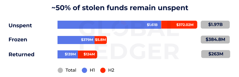 Az első időszak elég hosszú is lehet, mert a Global Ledger vizsgálatának időpontjában az ellopott pénz nagyjából fele még mindig mozdulatlanul hevert kriptotárcákban. Ez az egyik oka annak is, hogy a visszaszerzés mértéke ezeknél az incidenseknél eléggé korlátozott volt. Mindössze a pénzek 9,52%-át sikerült befagyasztani, és 6,52%-át visszaszerezni. A harc tehát 2025-ben is tovább folytatódott a hackerek és a platformok között. A hackerek az első szakaszban gyorsabbak lettek, a másodikban viszont a szigorúbb ellenőrzések miatt jóval lassabbak lettek.