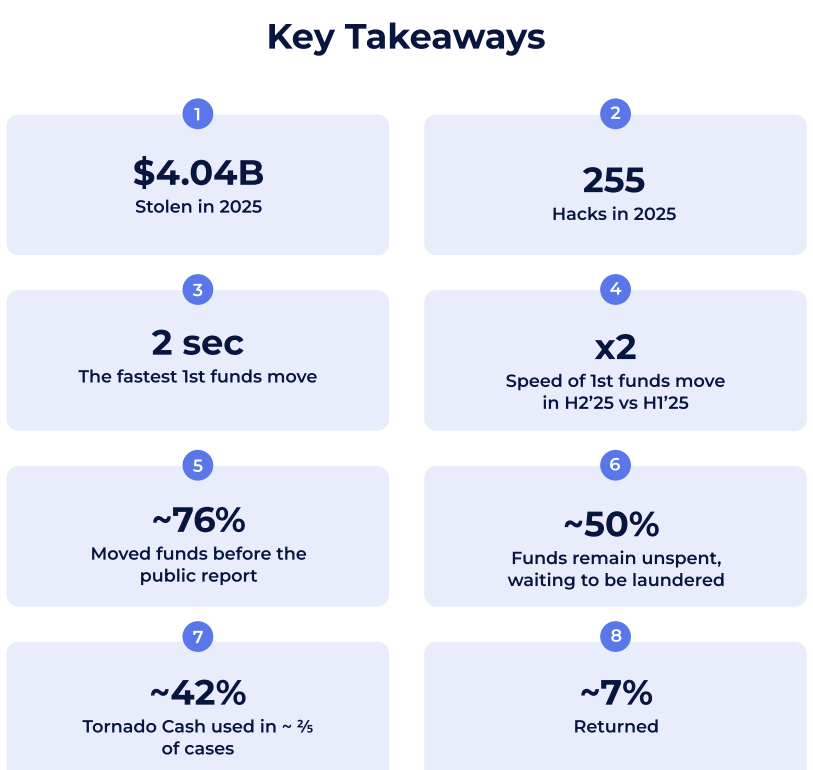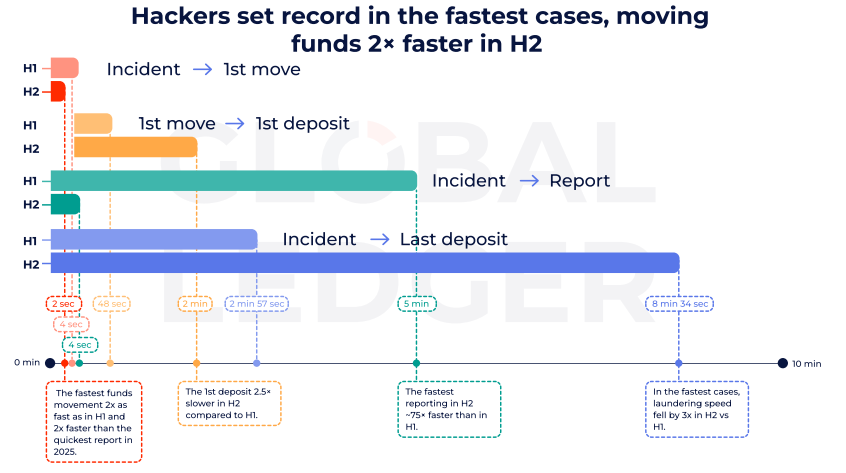 A blokkláncok elemzésével és kiberbiztonsággal foglalkozó kutatócég, a Global Ledger közzétette 2025-ös elemzését, amelyben 255 kriptós hacket vizsgált meg. Ezekben több mint 4,04 milliárd dollárnyi kár keletkezett. A legfontosabb konkluziója az volt a vizsgálatnak, hogy a támadók akár már a támadás megkezdése után két másodperccel megkezdik a lopott pénz mozgatását. Általánosságban már azelőtt átmozgatják az eszközöket, hogy az áldozat be tudná jelenteni a támadást.