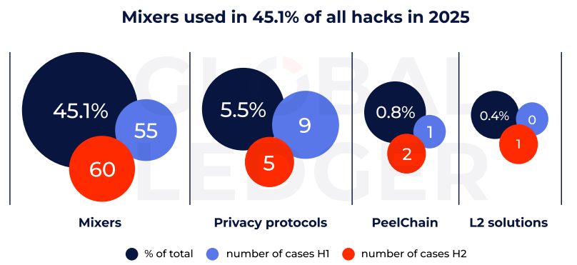 A Global Ledger jelentésében még egy fontos trend volt megemlítve. Eszerint most már a hidak váltak a fő útvonalakká a pénzmosási folyamatban. A vizsgált 255 támadásban ellopott összeg közel fele – mintegy 2,01 milliárd dollár – blokklánc-hidakon haladt át. Ez több mint háromszorosa annak, amit mixereken vagy adatvédelmi protokollokon keresztül mozgattak. A Bybit‑esetben például a lopott pénzek 94,91%-a hidakon keresztül áramlott.