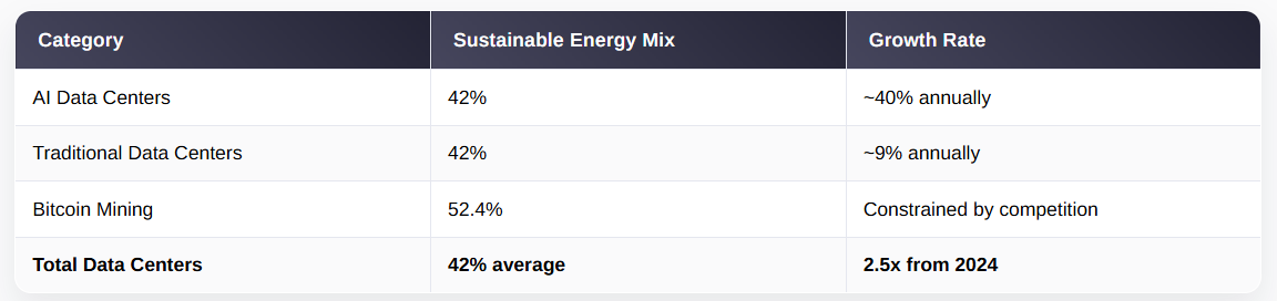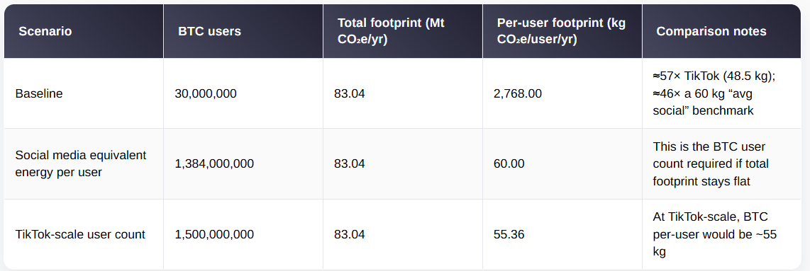 A Bitcoin megújuló energiakeveréke jelenleg 43%: vízenergia 23,12%, szél 13,98%, napenergia 4,98%. A nukleáris energia 9,8–10%-ot ad, így a fenntartható energia összesen 52,4%. A földgáz váltotta a szenet fő fosszilis forrásként (38,2%), míg a szén 8,9%-ra esett vissza (2022-ben még 36,6% volt). A Bitcoin felhasználónkénti környezeti hatása évente kb. 2 768 kg CO₂ egyenérték, 30 millió globális felhasználót számolva. Ez 57-szerese a TikTok 48,5 kg/felhasználó értékének, és 46-szorosa az átlagos közösségi média felhasználó 60 kg-os lábnyomának.