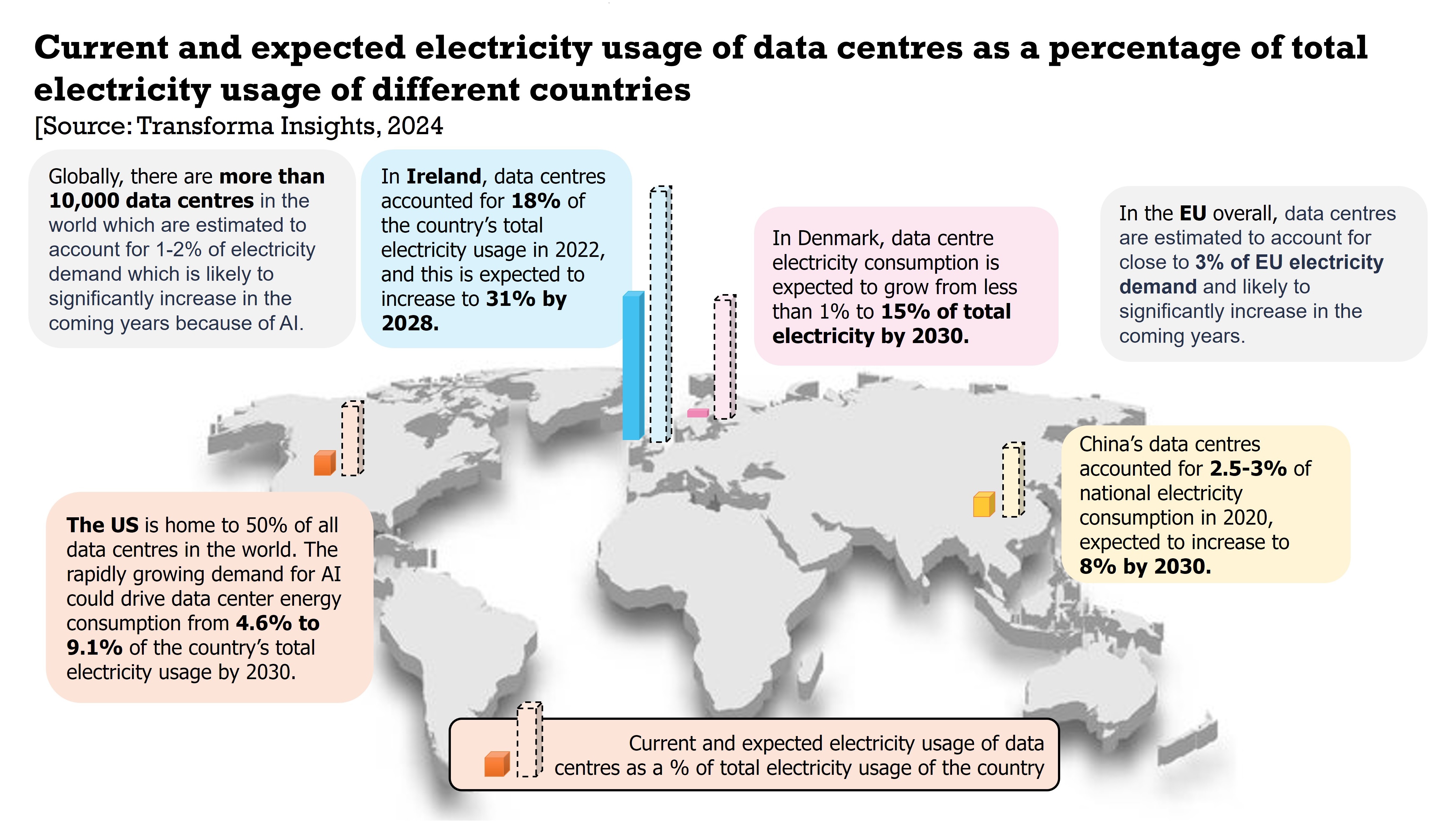 Az olyan gigászok, mint az Amazon, Microsoft, Meta, Google 50 GW megújuló energiaforrást kötöttek le már eddig is – ez Svédország teljes kapacitása. Az USA és Kína adják a növekedés 80%-át 2030-ig, de Írország teljes nemzeti energiakapacitásának akár 32%-a is mehet adatközpontokba 2026-ban.