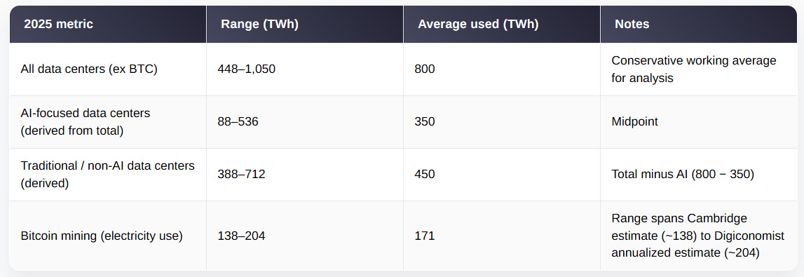 A Bitcoin-bányászat 2025-ben körülbelül 171 TWh energiát fogyasztott, ami az adatközpontok teljes energiafelhasználásának 16%-át jelenti. Csak hogy legyen róla fogalmunk, ez 78 millió magyar átlagos háztartás fogyasztásának felel meg. A hagyományos adatközpontok világszerte a becslések szerint valahol 448 és 1 050 TWh közötti energiát használtak fel 2025-ben, de nagyon eltérő felmérési adatok vannak. A Gartner előrejelzése szerint ez 2030-ra elérheti a 980 TWh-t, míg az IEA adatai szerint már idén átléphetjük az 1 000 TWh-s küszöböt – bár van olyan becslés, ami szerint ez már rég megtörtént. Az AI-központú létesítmények fogyasztására is csak nagyon túlzó becslések vannak – egyes elemzések szerint 82 mások szerint 536 TWh közötti energiát fogyasztottak 2025-ben.