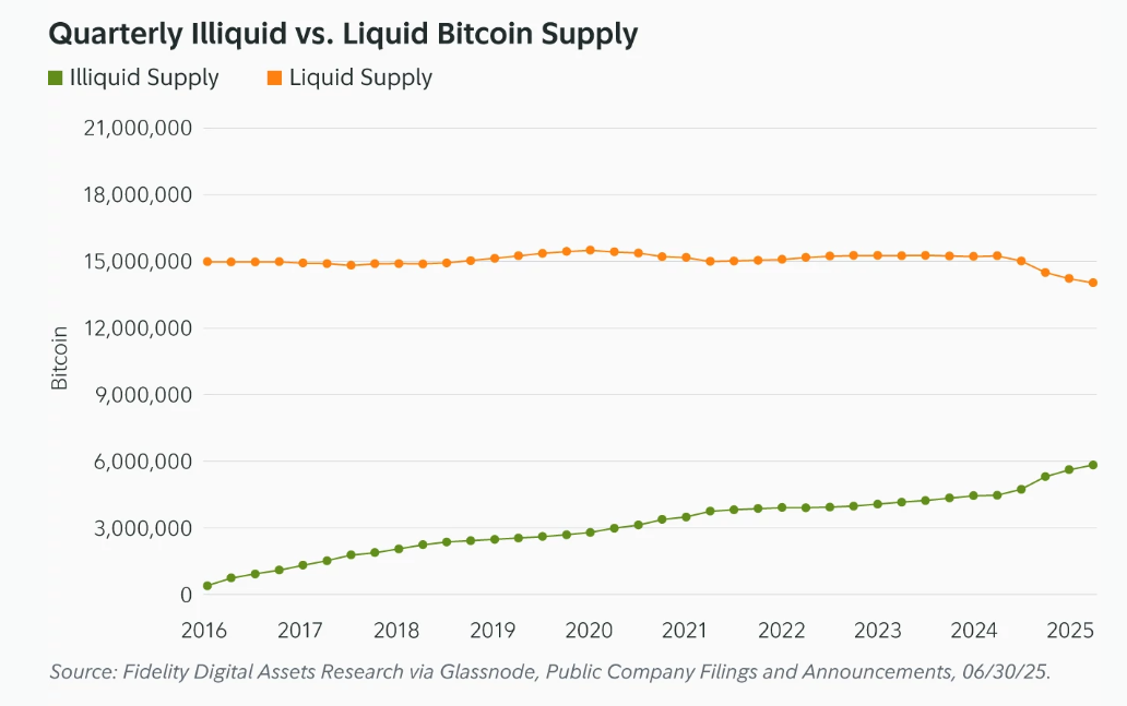 A Fidelity vagyonkezelő cég előrejelzése szerint a BTC forgalomban lévő kínálatának 42%-a hét éven belül piacról kivonttá válhat, mivel a vállalati tartalékok és a hosszú távú tulajdonosok felhalmozzák a coinokat. Az elemzés szerint 8,3 millió BTC kerülhet ki az aktív kereskedésből. A kutatás szerint két fő csoport hajtja előre ezt a trendet és a készletcsökkenést. Azok a hosszú távú tulajdonosok, akik legalább hét éve nem mozgatták a coinjaikat, továbbra is növelik pozícióikat eladás nélkül.