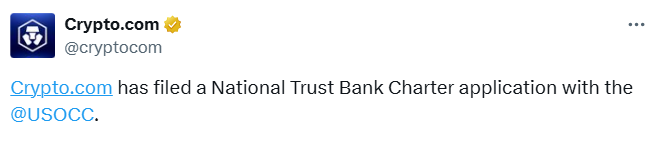 A Crypto.com kriptotőzsde október 24-én, pénteken bejelentette, hogy országos bizalmi banki engedély (national trust bank charter) iránti kérelmet nyújtott be az Egyesült Államok Valutaellenőr Hivatalához (Office of the Comptroller of the Currency – OCC). Ez egy hivatalos kérelem, amelyet egy pénzügyi intézmény nyújt be az OCC-hez, hogy szövetségi szinten működő bizalmi bankként legyen elismerve az Egyesült Államokban. Így letétkezelési, vagyonkezelési és digitális eszközökkel kapcsolatos szolgáltatásokat nyújthasson és ne kelljen külön engedélyeket beszereznie minden egyes amerikai államban.