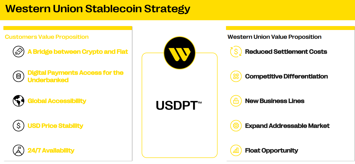 McGranahan elmondta egy kérdésre válaszul azt is, hogy az USDPT-t nem fogyasztók számára szánt stabilcoinként vezetik be, hanem a vállalat által jelenleg használt SWIFT-hálózat alternatívájaként, amelyet az ügynökökkel való elszámolásra használnak. Az USDPT várhatóan kiválasztott országokban, kiemelt fontosságú ügynökpartnerekkel indul el, láncon belüli elszámolást lehetővé téve, ami gyorsabb feldolgozást biztosít – a hagyományos banki ünnepnapok alatt is. Az USDPT mellett a Western Union két olyan szolgáltatás bevezetéséről is bejelentést tett, amelyek a stabilcoint egy tágabb ökoszisztémába integrálják.