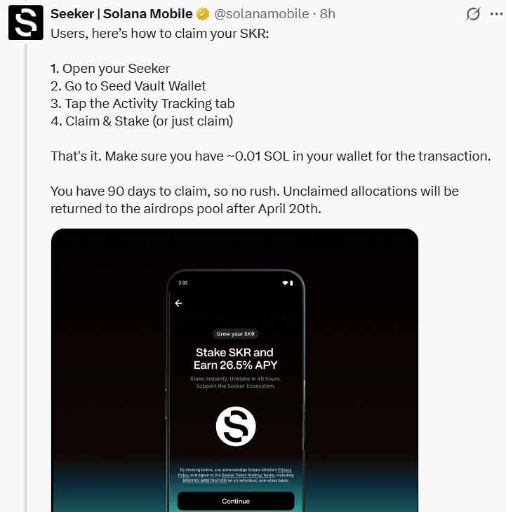 Az airdrop során 188 fejlesztő és több mint 100 ezer felhasználó vált jogosulttá coinokra. A keddi közlemény szerint a Seeker telefon felhasználói a beépített tárcán keresztül igényelhetik (és stakelhetik) SKR tokenjeiket. Erre 90 napos időablak áll rendelkezésükre, amely után a nem igényelt coinok visszakerülnek az airdrop poolba. Az SKR az a natív kriptovaluta, amelyet az ökoszisztéma működtetésére hoztak létre irányításra, ösztönzésre stb.). Teljes kínálata 10 milliárd coin, amelyből 30% az airdropokra és a nyitáskor történő kiosztásra van elkülönítve. A Solana Mobile arra ösztönzi az airdrop résztvevőit, hogy stakeljék a kapott tokenjeiket. Ezzel próbálja elkerülni a projekt, hogy ne azonnal eladja mindenki a coinokat, hanem a közösségi részvétel hosszabb távú legyen.