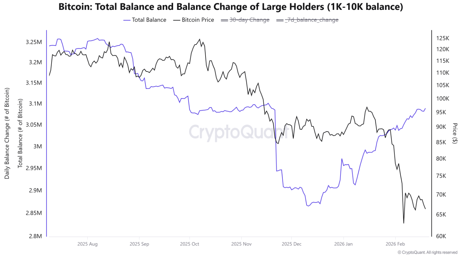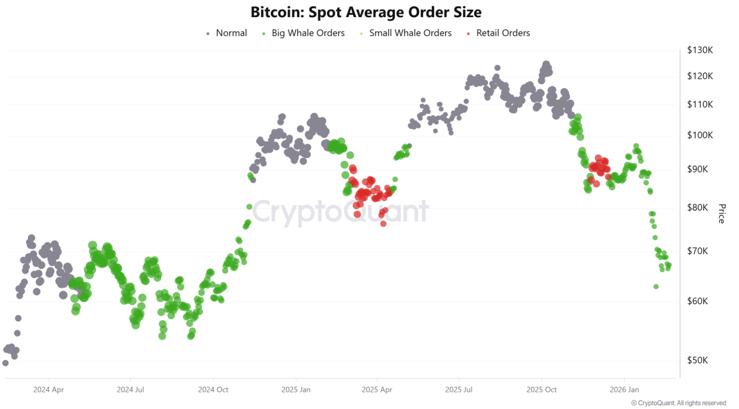 A trend az elmúlt 30 napban fordult meg igazán, amikor a bálnák 98 ezer Bitcoint vásároltak. A korábbi, készletcsökkenéssel egybekötött időszak még 2025 augusztusában kezdődött, miután a Bitcoin árfolyama elérte a 124 000 dolláros csúcsot, és ezt követően csökkenésbe fordult. 2026 egészében a Bitcoin spotpiacán (a valós, azonnali adásvételi piacon) nagyon nagy méretű megbízások jelentek meg. Az átlagos megbízásméret 950 és 1 100 BTC között mozgott. Ekkora megbízásokat csak intézményi befektetők, alapok vagy nagyon nagy magánbefektetők adnak. Hasonló mintázatok jelentek meg a 2025 február–márciusi korrekció idején is.