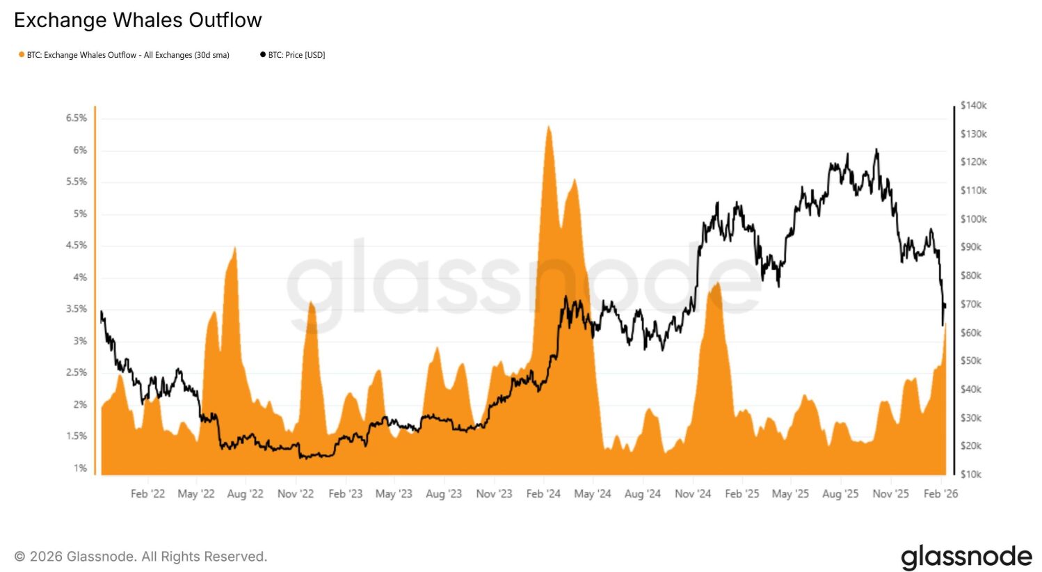 A Glassnode adatai szerint a bálnák az elmúlt 30 napban átlagosan a tőzsdéken tartott teljes Bitcoin‑készlet 3,5%-át utalták ki. Ez a leggyorsabb ütem 2024 novembere óta. A jelenlegi tőzsdei egyenlegek alapján ez 60 000–100 000 BTC kivonását jelenti az elmúlt hónapban. Bár a bruttó beáramlások is emelkedtek, a magas kivonási arány arra utal, hogy a beérkező BTC nagy részét erős kiáramlás ellensúlyozza, így a nettó tőzsdei egyenlegek viszonylag stabilak maradtak.