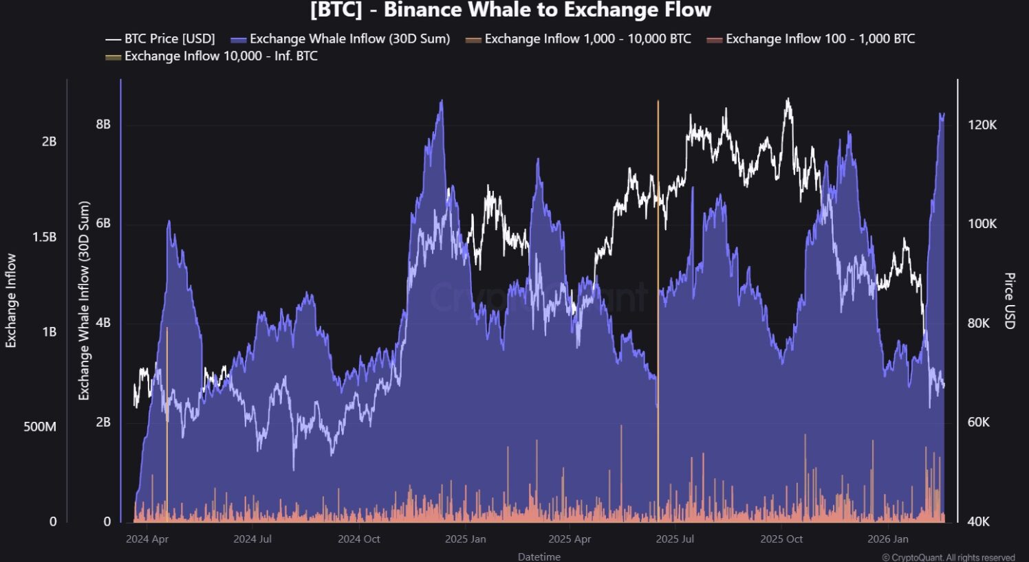 Akkor a kiskereskedelmi megbízások domináltak, míg a nagy blokkok ritkábban és kisebb klaszterekben jelentek meg. Az elmúlt 30 napban 8,24 milliárd dollár értékű BTC áramlott be a Binance-re bálnáktól, ami 14 hónapos rekord. A kiskereskedelmi beáramlás 11,91 milliárd dollárt ért el, és az utóbbi időben stagnál. A kiskereskedők és bálnák aránya jelenleg 1,45, és tovább csökken, ahogy a nagyobb méretű beutalások nőnek.