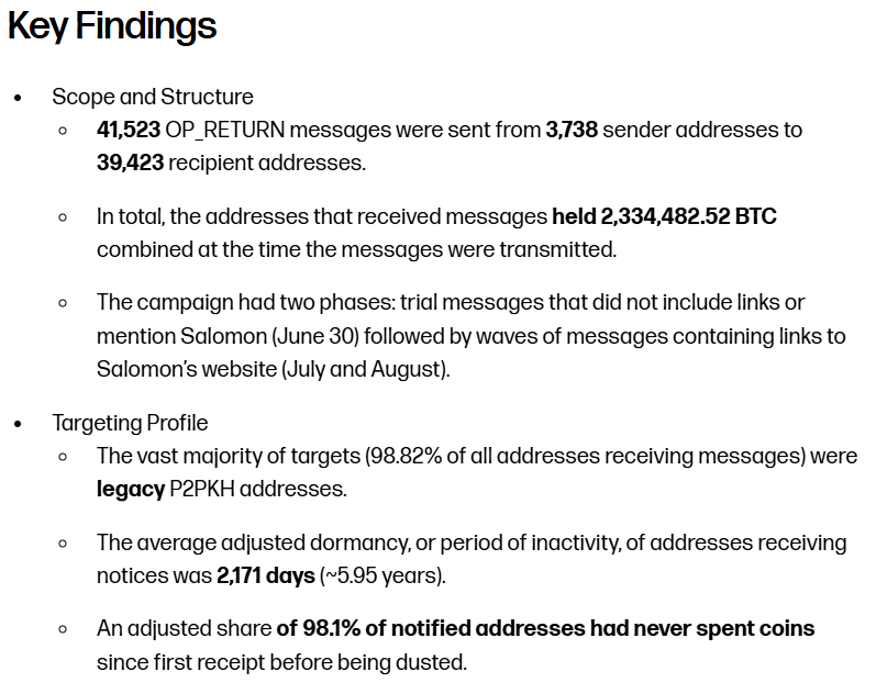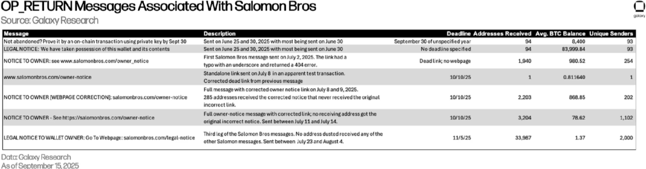 Az érintett cég a Salomon Brothers, amely egy, már több mint 20 éve megszűnt Wall Street-i bank. Most állítólag néhány volt alkalmazottja megvásárolta a cég nevéhez fűződő jogokat. Ezek a tulajdonosok egy ügyféllel együttműködve indították most el az akciójukat, hogy megpróbáljanak hozzáférni több millió bitcoinhoz. A cég körülbelül 40000 tárcába apró tranzakciókat küldött. Minden tranzakció tartalmazott egy láncon belüli üzenetet, amelyben azt állították, hogy a tulajdonosnak bizonyítania kell, hogy a bitcoinnak van tulajdonosa. Ha a cég 90 napon belül nem kapott választ, akkor figyelmeztette a tulajdonost, hogy jogi eljárást indíthat. Furcsa módon az egyik OP_RETURN üzenet, amely egy teszt tranzakcióhoz kapcsolódott, így szólt: „Köszönöm, hogy életet adtál nekem. Most visszakapod a valódi pénzedet.”