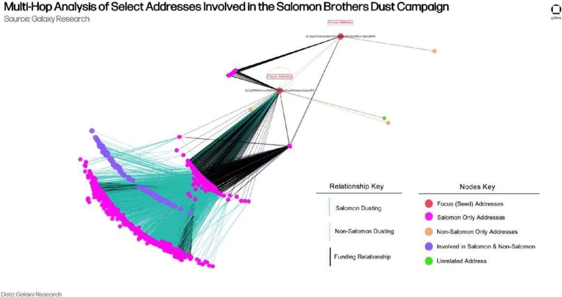 Ezeket az üzeneteket olyan tárcáknak küldték el, amelyek összesen körülbelül 2,33 millió BTC-t tartalmaztak. Néhány tulajdonos egyértelműen megrémült a figyelmeztetésektől. Volt egy felhasználó, aki körülbelül 9,7 milliárd dollár értékű coint mozdított el valószínűleg félelemből. Persze az is jogos kérdés, hogy ez egyáltalán csalás vagy támadás-e. Maga a Salomon Brothers egy közleményben szimplán a láncon belüli biztonság növelésére irányuló kísérletnek nevezte az akciót. Azt is hangsúlyozták, hogy nem akarják kedvezőtlenül befolyásolni a kriptopiacot, vagy tulajdonjogot igényelni olyan tárcákra, amelyek valójában nem elhagyatottak. A dusting akcióban érintett tárcák négyszintű kapcsolati hálója:
