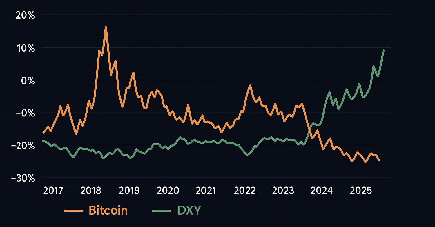 gyakran épp akkor éri el csúcsát, amikor a dollár is kitör egy hosszabb gyengülési szakaszból. A múlt tapasztalatai alapján a két fizetőeszköz között különös tánc zajlik: ha a dollár erősödni kezd, a Bitcoin előbb-utóbb megtorpan. De vajon most is ez történik?
