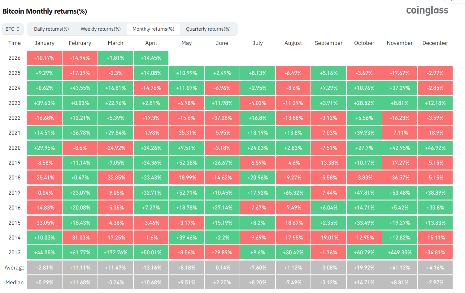 A pusztán történelmi minták alapján a bitcoin májusi legvalószínűbb forgatókönyve az oldalirányú vagy volatilis árfolyammozgás, enyhe eltolódással a konszolidáció, nem pedig a kitörés felé. Ennek ellenére a történelem azt is mutatja, hogy a nagy pozitív májusi hónapok általában erős bikaciklusokban fordulnak elő. A meredek esések pedig gyakran külső sokkokhoz kötődnek, nem magához a szezonalitáshoz.