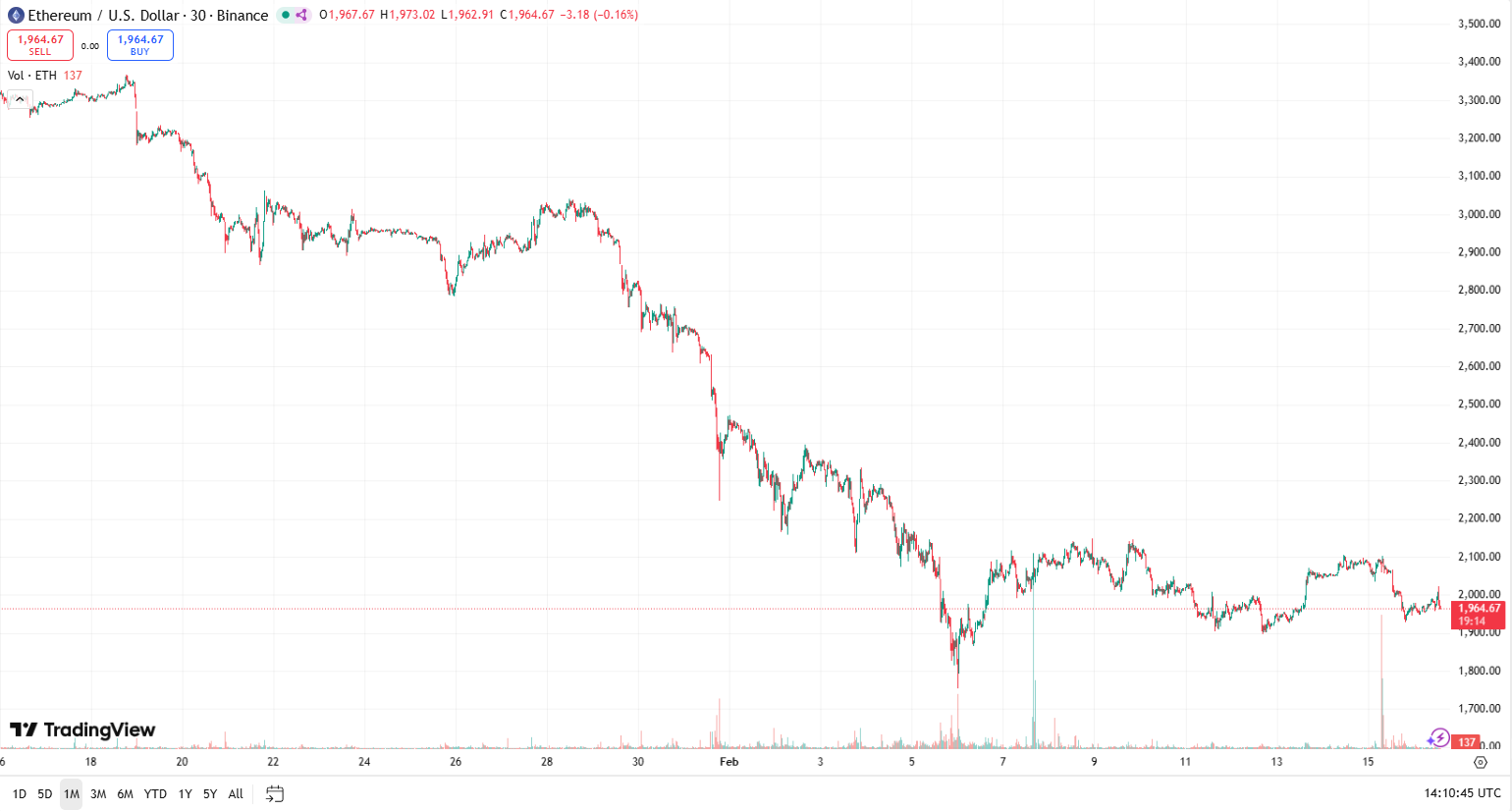 Hétfőn az Ethereum 1980-2000 dollár között mozgott, ami a korábbi, 2060 dolláros szintről számítva néhány százalékos visszaesést jelent. Havi összevetésben az árfolyam jelentősen, közel 40 százalékkal alacsonyabb a januári, 3300 dollár körüli szinthez képest, éves alapon pedig szintén számottevő csökkenés látható. A napi kereskedési volumen 26 milliárd dollár körül alakul, ami továbbra is élénk piaci aktivitásra utal.
