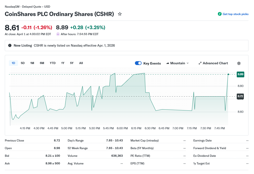 A CoinShares PLC szerdán jelent meg a Nasdaqon, ahol a CSHR tickert kapta. A kereskedési nap azonban meglehetősen rosszul indult: nem elég, hogy az általános piaci hangulat is meglehetősen viharos volt, a vállalat részvénye egy 25%-os eséssel kezdte a kereskedést, melynek nyomán 8,3 dollárig esett vissza.